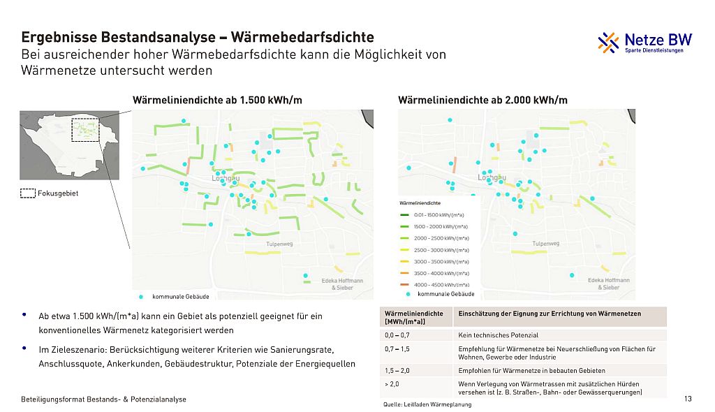 Daneben wurden die Wärmebedarfsdichten betrachtet. Bei einer Wärmeliniendichte von 1,5-2,0 MWh/(m*a) besteht Potenzial für ein Wärmenetz. Bei Betrachtung der Wärmeliniendichte von 1,5 bzw. 2,0 zeigt sich bereits, dass nur in einigen wenigen Straßen diese Wärmedichte erreicht wird. Dabei muss noch berücksichtigt werden, dass durch künftige energetische Sanierungen bei den Gebäuden der Wärmebedarf noch abnehmen wird.