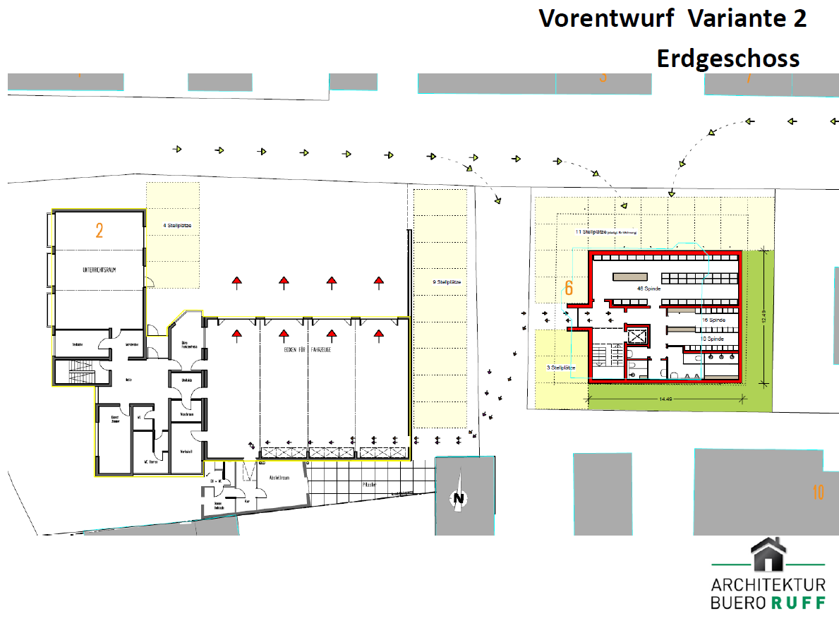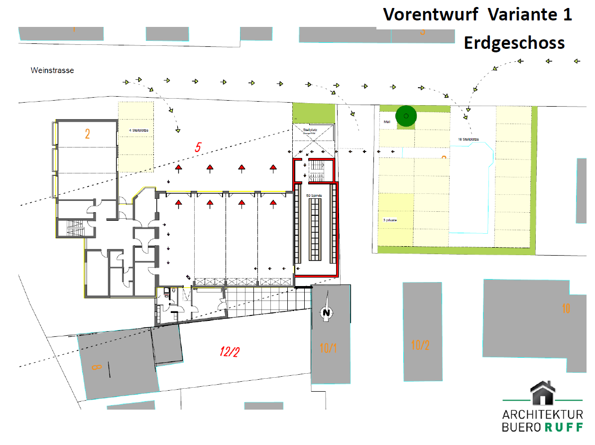 In einer ersten Variante würde an die Fahrzeughalle ein Anbau vorgesehen werden, der die Umkleidebereiche für die aktiven Feuerwehrkameraden samt Sanitäranlagen beinhalten könnte. Im Obergeschoss könnten Räumlichkeiten für die Jugendfeuerwehr sowie für Lagebesprechungen vorgesehen werden. Die erforderlichen zusätzlichen Stellplätze könnten auf dem Grundstück der Weinstraße 6 platziert werden.