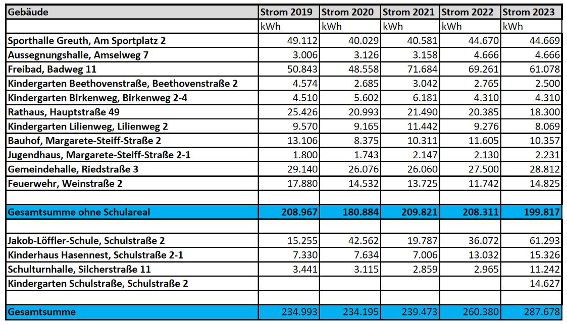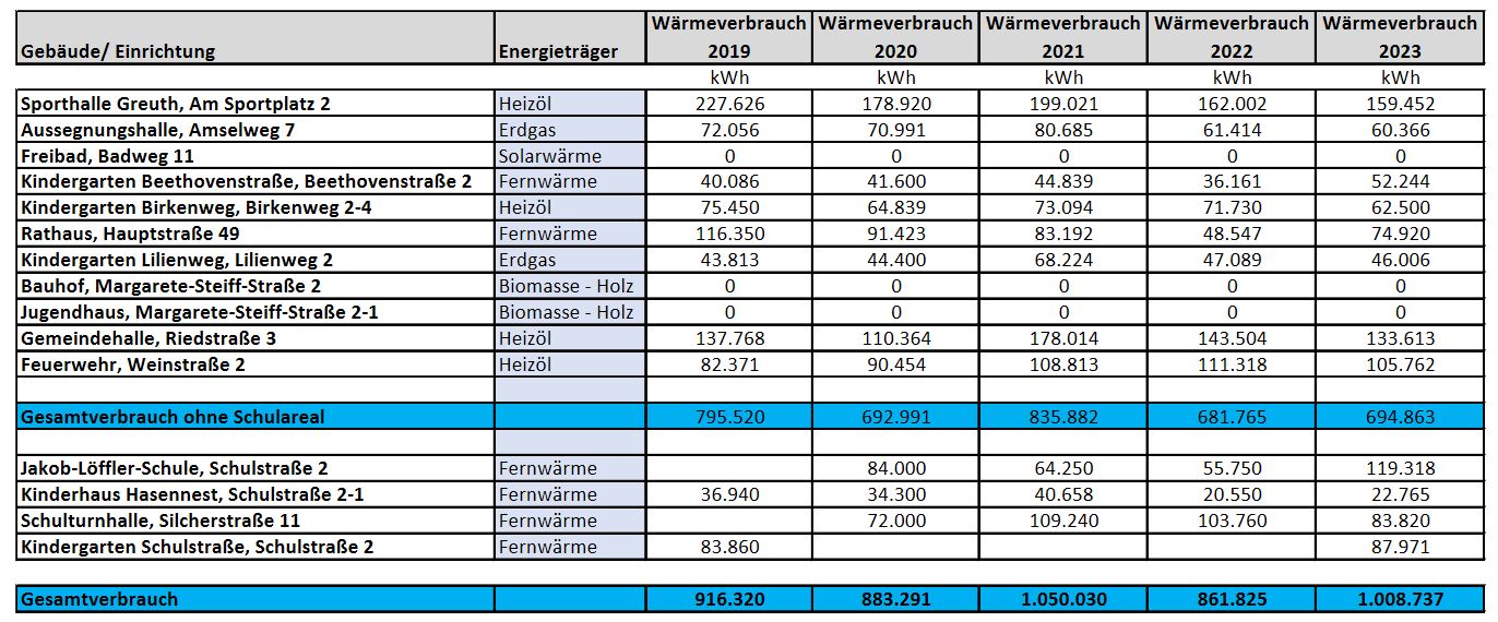 Mit beigefügten Tabellen der Erfassungen nach § 18 Klimaschutzgesetz BW wurde das Gremium über die Entwicklung des Wärme- und Stromverbrauchs über den Zeitraum der Jahre 2019 bis 2023 informiert. Grundsätzlich ist ein Vergleich im Referenzzeitraum auf Grund der Corona-Pandemie mit den teilweise verbundenen Schließungen der Einrichtungen sowie der Energiekrise in Folge des Ukraine-Kriegs nur bedingt geeignet. Deshalb ist der Vergleich der Jahre 2019 und 2023 noch am Aussagekräftigsten.Herr Gabler stellte dem Gremium eine Erläuterung, Ausblick der weiteren Planung und zu erwartenden Entwicklung vor: Wärmeverbrauch Allgemein:Während der Energiekrise 2022 wurden, wo möglich, die Temperaturen während der Wintermonate stark reduziert.Es wurde eine Heizrichtlinie erstellt, die ab diesem Winter gelten soll (siehe Anlage).Die Coronazeit hat zu erhöhten Verbräuchen geführt, da immer wieder viel gelüftet und danach wieder aufgeheizt werden musste. Je nach Einrichtung, Nutzung und Heizungsart hatte das starke oder weniger starke Auswirkungen auf den Gesamtverbrauch. Auffällige Verbrauchsveränderungen in den Objekten:In der Sporthalle Greuth wurde eine vertretbare Temperaturabsenkung aus der Energiekrise beibehalten.In der Aussegnungshalle wurde 2022 eine gleichbleibend niedrigere Temperatur festgelegt und auf Spitzenaufheizungen zu den Beerdigungen verzichtet.Der Wärmeverbrauch im Kindergarten Lilienweg ist durch die neue Krippe erhöht, da wir dort keine Fußbodenheizung haben.Beim Kindergarten Beethovenstraße kann aus technischen Gründen nur der Verbrauch des gesamten Gebäudes einschließlich der Wohnungen ermittelt werden. Da die Wohnungen inzwischen alle belegt sind, stieg auch entsprechend der Verbrauch.Das Rathaus ist seit Oktober 2021 an die Nahwärme im Ortskern angeschlossen, wird nicht mehr per Gas beheizt und hat daher eine neue effizientere Steuerung erhalten. Der Primärenergiefaktor liegt bei 0,37 (Vgl. Erdgasheizung 1,1).Die Effizienz der alten Heizung in der Feuerwehr lässt Jahr für Jahr nach. Dazu kommen Defekte und Reparaturen.Durch die Sanierungsphasen im Schulareal lassen sich die Verbrauchswerte noch nicht effektiv vergleichen. Früher Ölheizungen, Nachtspeicheröfen – heute alles über die Nahwärmezentrale. Im Vergleich zu 2019 wurde der Wärmeverbrauch (ohne Schulareal) von 795,5T kWh auf 694,8T kWh gesenkt, was einer Reduzierung von rund 13% entspricht. Wirtschaftliche und energieeffiziente Biomasse-Heizungen sind außerdem für die Sporthalle Greuth und die Gemeindehalle geplant. Mit diesen wird der zu dokumentierende kWh-Verbrauch der kommunalen Liegenschaften weiter spürbar gesenkt.Neue, energieeffiziente Heizungen in Kindergarten Birkenweg und Feuerwehr müssen noch in Planung gehen. Stromverbrauch: Allgemein:Die Coronazeit hat sich beim Strom je nach Einrichtung ausgewirkt (z.B. Kindergarten mehr, Hallen weniger Stromverbrauch) Auffällige Verbrauchsveränderungen in den Objekten:Zu erwartende Einsparung im Freibad ab 2024, durch neue, effizientere und stromsparende Pumpen, ca. 30% (- 4.000 kWh/Monat)Der Rathausstrom wird inzwischen zu 70% durch das BHKW der Nahwärme erzeugt. Ab 2024 unterstützt durch die PV-Anlage mit Stromspeicher.Sanierung, Umbau und Erweiterungen machen den Stromvergleich auf dem Campus-Gelände schwierig (z.B. durch Baustromphasen, fehlende Zähler, Neuprogrammierung der GLT).Allerdings wird ca. 55% des Stromverbrauchs auf dem Campus-Gelände durch das Nahwärme BHKW erzeugt. Bemerkungen:Einsparungen bei der Beleuchtung konnten bereits durch die Umrüstung auf LED-Leuchtmittel realisiert werden. Die Gemeindehalle wird 2025 umgestellt (hier warten wir seit 12 Monaten auf die Genehmigung der beantragten Fördermittel).Ab 2024 sind weitere Einsparungen beim Stromverbrauch zu erwarten, wenn die installierten PV-Anlagen und Stromspeicher in die Auswertung mit einfließen.